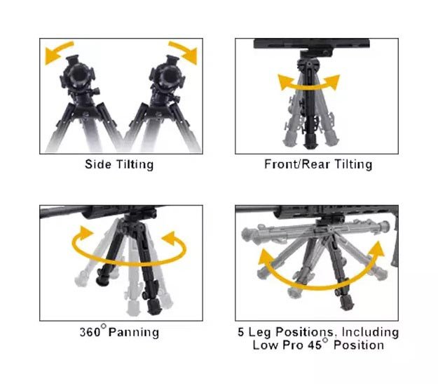 - Unique Tension Adjustable 360-degree Panning with Multi-axial Tilting Base to Achieve Virtually Any Desired Bipod Adjustment