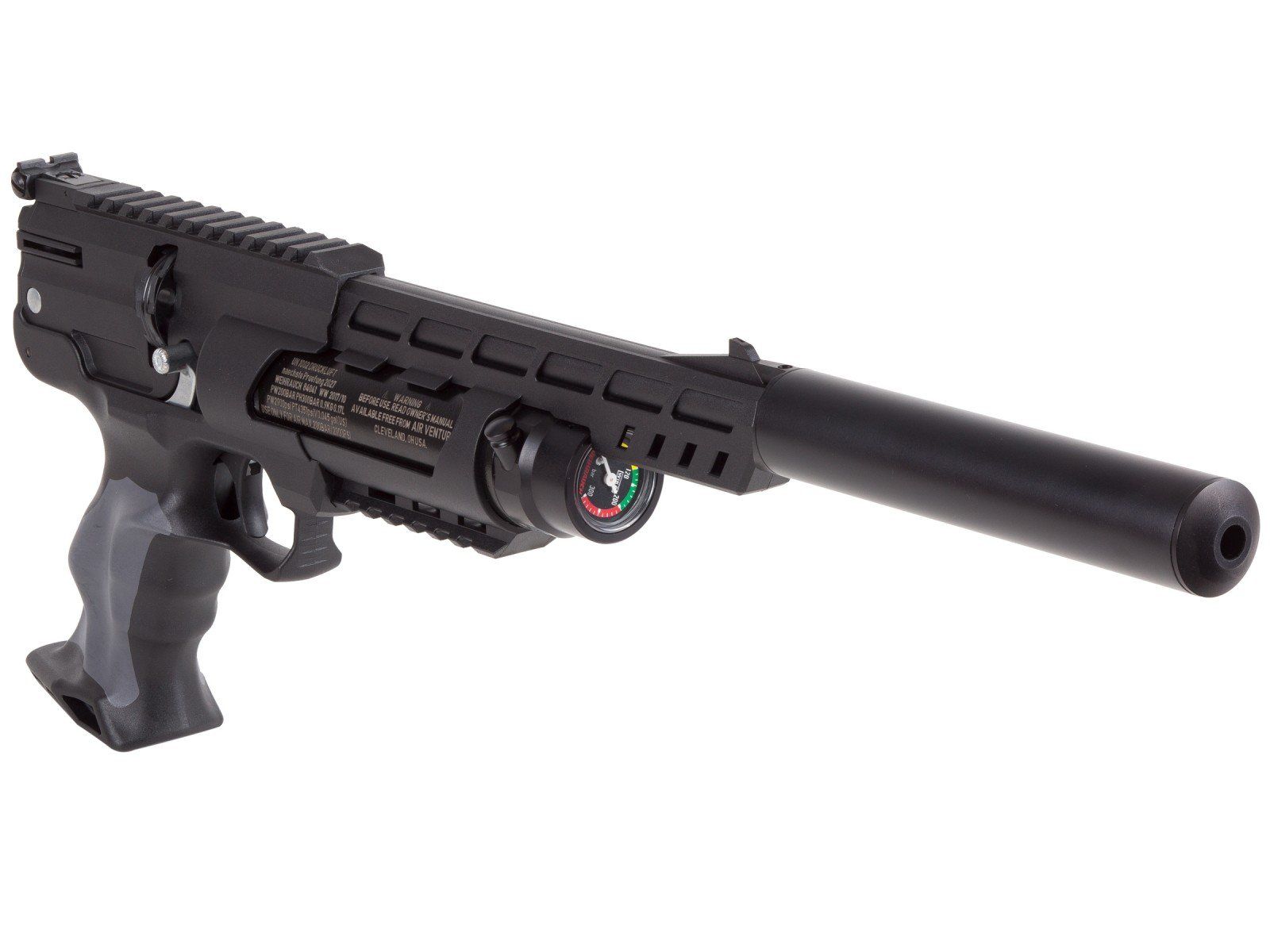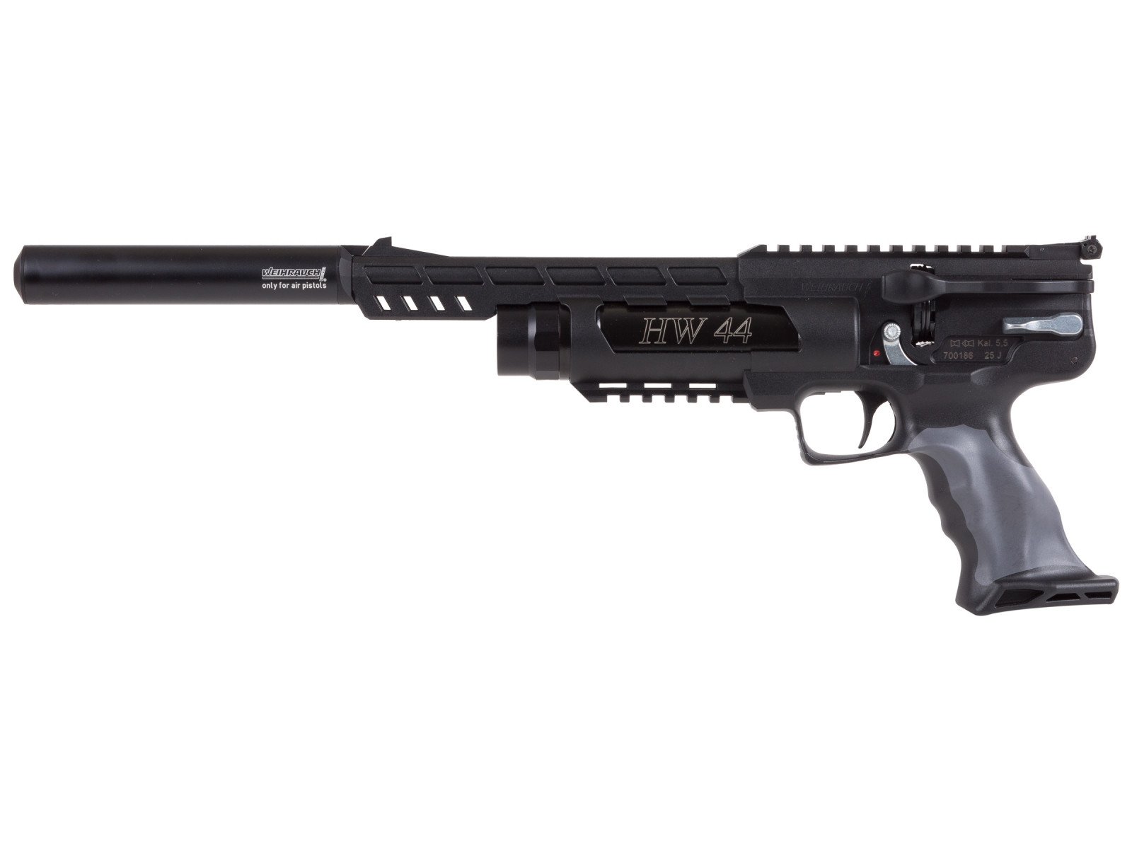 Each HW44 uses the same 10-shot rotary magazine as the HW110 and is powered by a 200 BAR/2900 psi cylinder to let its shots fly at 750 fps in .177 and 570 fps in .22. Sent shots screaming downrange with a simple pull of its sidelever to keep shooting. The HW44’s Weaver/Picatinny accessory rail and scope rail give you a lot of choices for optics whether red-dot sights, flashlights, or lasers–a rare sight in PCP pistols. A 2-stage trigger keeps your pulls crisp and clean and the non-removable suppressor keeps your shots quiet.